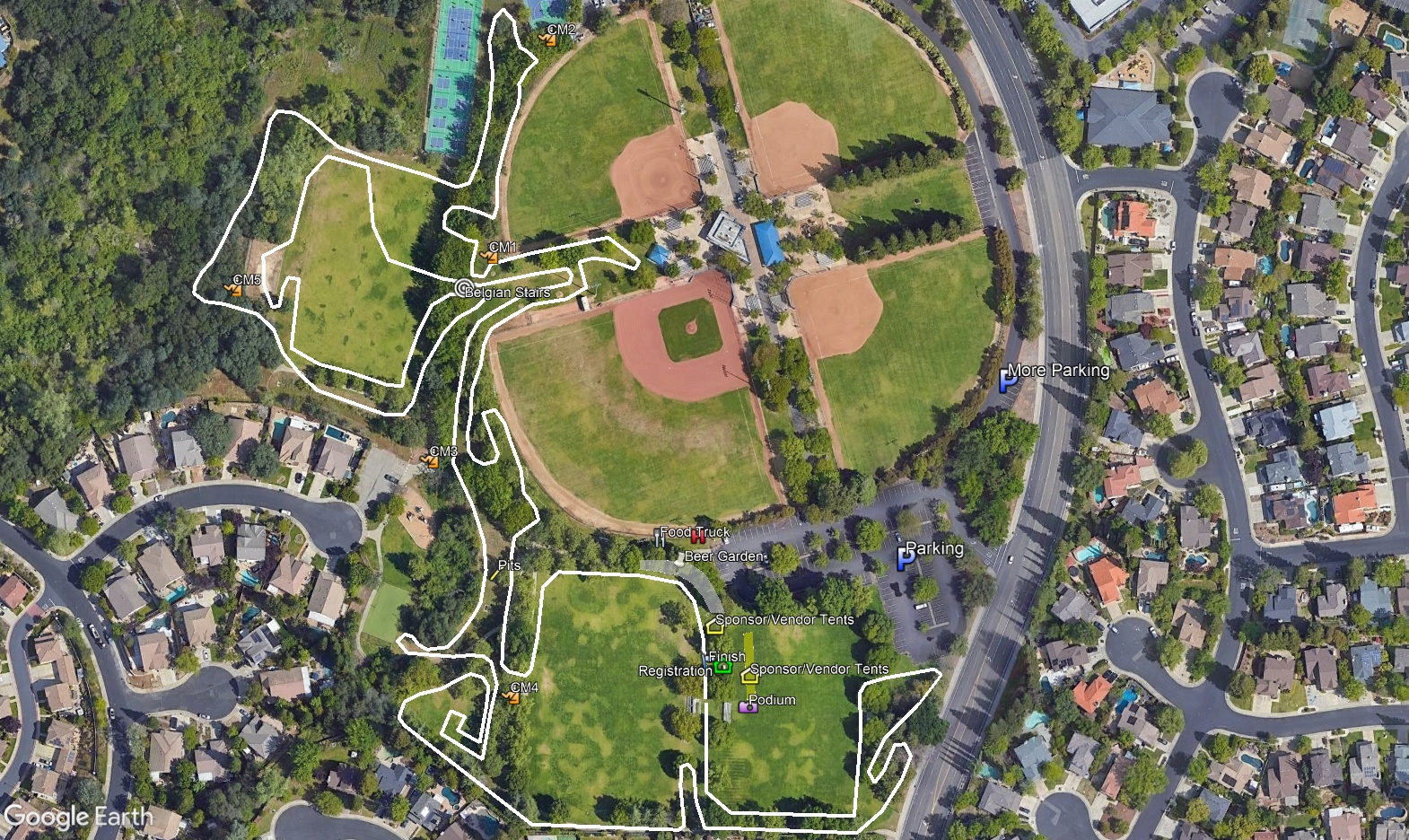Lembi Park is a compact park that makes for a fun course and great spectating! Our course utilizes the hillsides featuring plenty of off-camber challenges, a sand pit, and we also build in a staircase for enjoyment. Thanks to the work by the City of Folsom, we now have access to an open space area below the sand pit which adds a cool wooded section to our classic course!